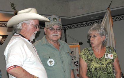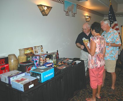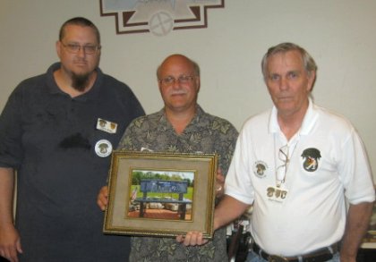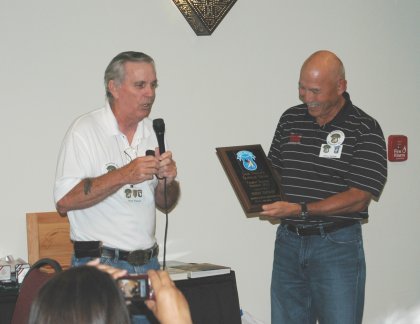 Chuck Steward presents Guamanian Perry Taitano a plaque for furthest distance traveled - 6702 miles! Perry was a first time attendee and served with the 75th IDCT attached to the 173rd Airborne Brigade. And Thanks to Chuck for doing a great job with the auction, and to all the Trackers that donated items, and to all that bid and purchased. Photo from Jim Cobb |