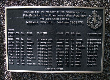 List of the members of the 8th Battalion killed in Malaysia 1967/69 and Vietnam 1969/70. Shown at Regimental Square, Sydney. Included is "15400 SGT W.J. Hoban BEM 28 February 1970" Lest We Forget... |