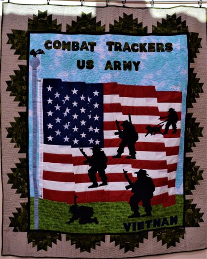 Beverly Walker. Great job and thanks from all the Trackers. To the left is this year's quilt by Yvonne Auer. Yvonne and husband Tom had a great write-up in their local paper. The article explained that Yvonne's quilts are an ongoing labor of love honoring the Combat Trackers. Every year her quilt is auctioned and the proceeds go to supporting our website and other Tracker efforts. This year Yvonne was presented a plaque in recognition of her work supporting the Trackers. Thanks to Sergeant Major Chuck Steward for making the presentation and to all that donated items for the auction. Photos on this page are from Ed Wheeler except when noted. |