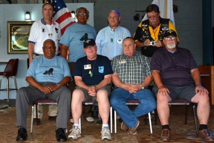 | The 1st Infantry Division. Left to Right: Front Row - Chuck Steward, Jearald Dudley, Bill Grady, Ed Wheeler. Standing- J.W. Goin, Tom Auer. Note the blue tracker dog t-shirt Jearald and others on this page are wearing - a gift from Dixie Whitman and the MWDTSA (Military Working Dog Team Support Association). Thanks Dixie! | |