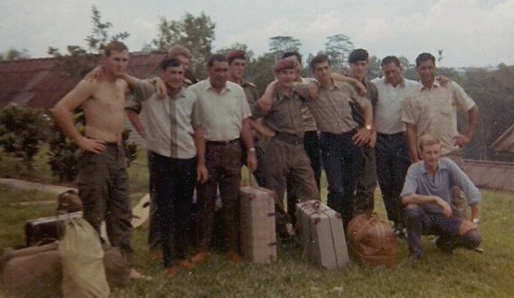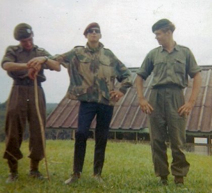 | Just arrived Yank students with instructors at BJWS. Center background with red beret and shoulder boards - Hugh Oakley-Browne, NZ SAS. We need help with identifying the others. From Rex Anderson 07/23/21 - Not Hugh Oakley-Browne, not NZSAS. Maybe Brit paras. | |