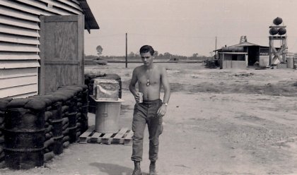 | Chow break. Left to right: Lab?, Robert Sepulveda?, ?, Roy Burchfield with British kit?, ?. | |