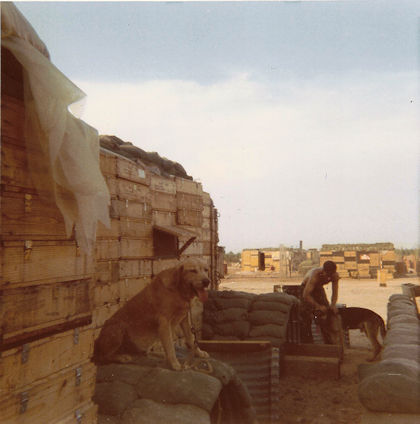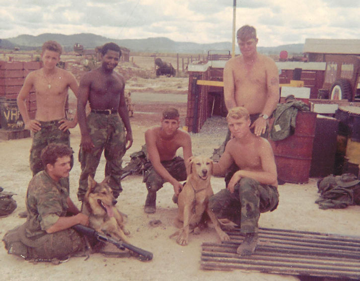 Benjamin, Jim Chaney. Kneeling L to R: Glen Bristol with scout dog Willie,