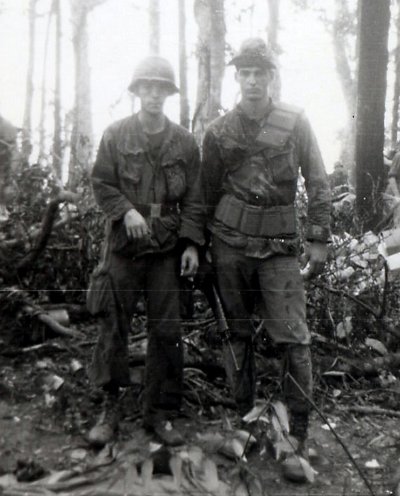 More photos from Bill added 27 January 2006! Thanks for this great photo of Doug Brothers and his High School friend John Norman. They ran into one another while John was a grunt with the line unit that Doug's Team was doing a tracking mission for! Thanks to Debbie Brothers for the info! . |