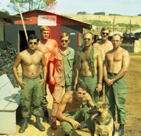 This photo shows from L-R: Reb Walker, Bruce, Doug Brothers, Lou Caputo, Bruce, Sgt. Gator, and Bill Bodnar and Rolf, (Scout Dog). |