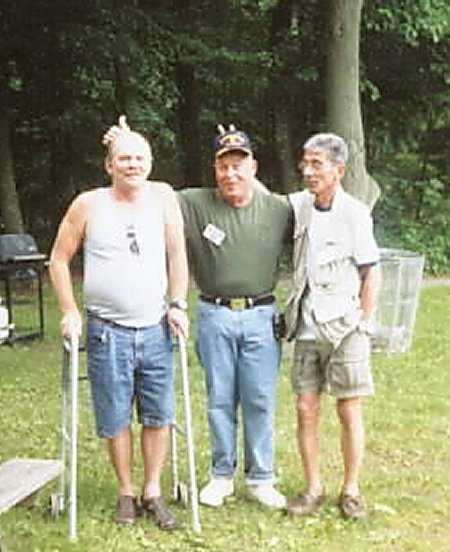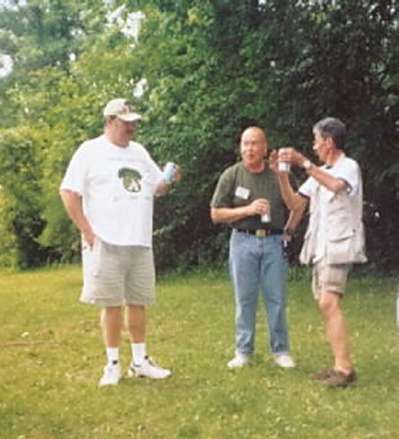 Here's Tom Auer, Frank Merritt and Ed Arnado discussing the quality of the beer they are ingesting. Ed is also a Cav Tracker and left his mountain hermitage for the first time in 35 years to join up with his fellow Trackers! Welcome home, Ed! |
