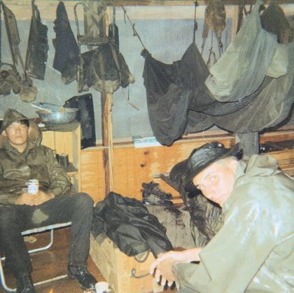 Gilmore with photo from Raymond Morris as noted. "Trying to get warm after the leaking roof repair. L-R Unknown and John Hughes." |