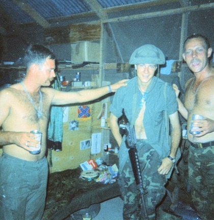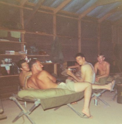 "Camp Evans having an after action report? L-R Barry Breaux, platoon sergeant Gill, John Hughes, and Don Hylton." |