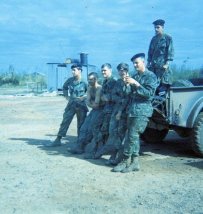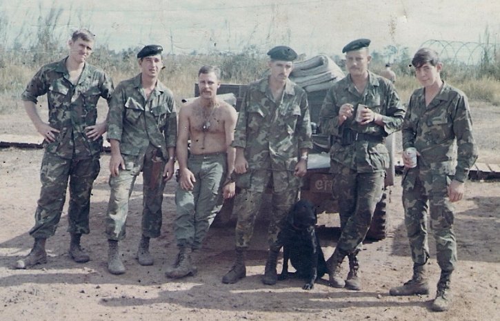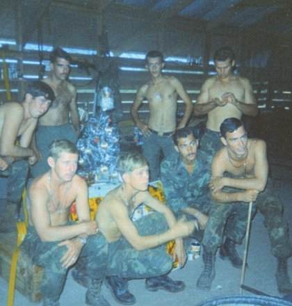 | From Raymond Morris: "Our team at Quan Loi and our platoon Sgt, without shirt. Left to Right Me (Raymond Morris), Cunningham, Sgt Tonelli, Simpson and his dog Lucky, SSgt Gill, Hutchinson. This picture taken at Phuc Vinh, Vietnam, Christmas day, 1968" | |