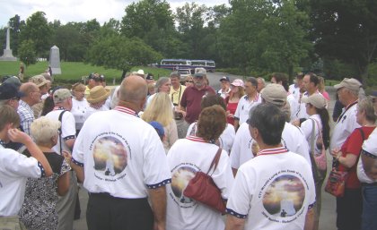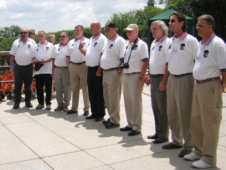 | Some of the group with the guard shack in the background. L to R: Grant Coates, Tom McLemore, John Carroll, "HoJo" Howard Johnson, Jerry Bates, Norm Shaw, Ed Wheeler, Chuck Steward, John Wagaman and Dave Folland. Coates, McLemore, Carroll, Johnson and Folland were first time attendees to a Tracker reunion. Photo from Don Hendricks | |